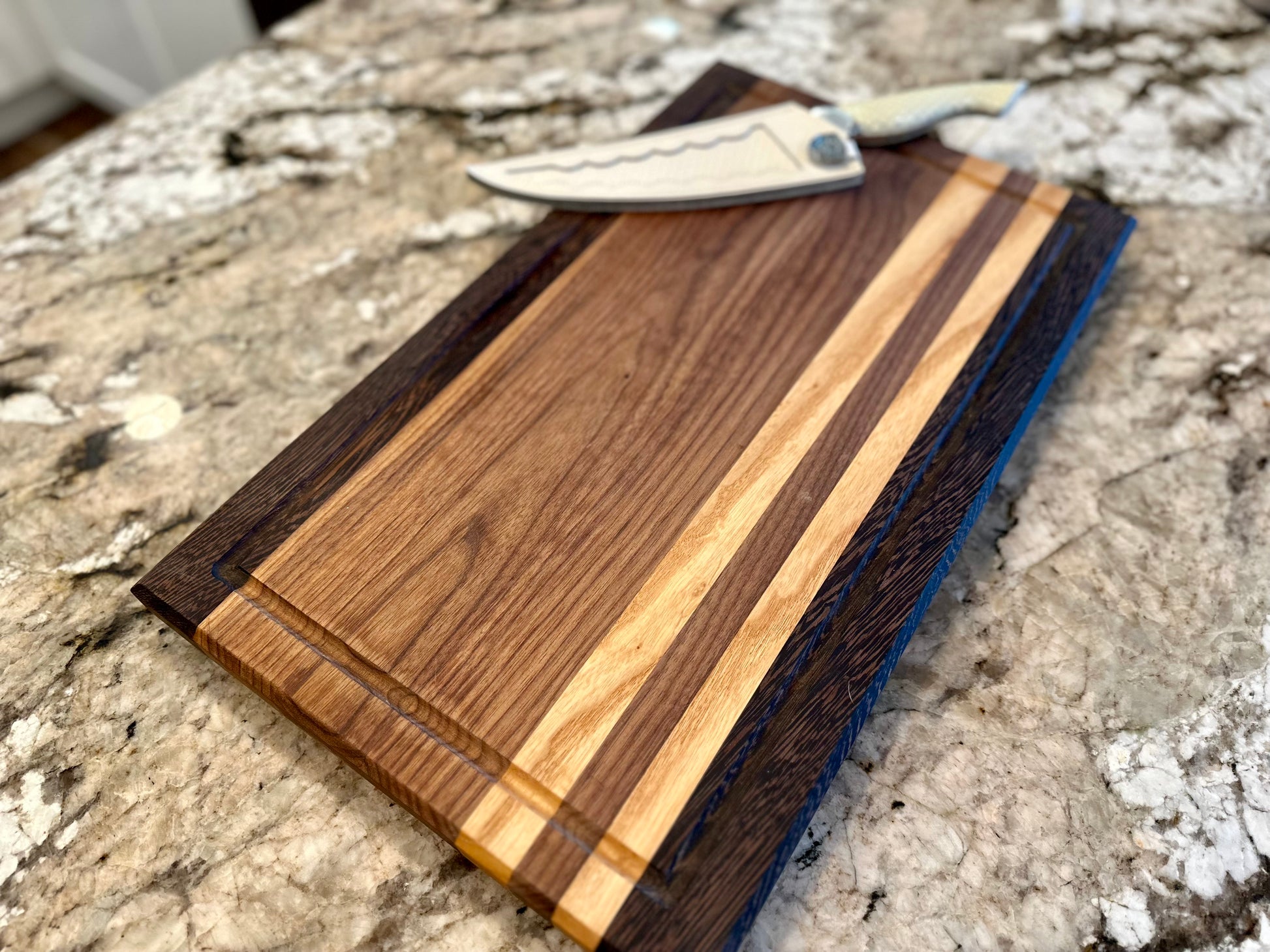 Handcrafted from Hard Maple, Walnut, and Wenge, this board brings the richness of nature into your kitchen. Deep juice grooves keep prep clean, while the contrasting wood tones create a striking centerpiece. Built to last and easy to care for, it’s ready to support everything from everyday chopping to elegant serving.
